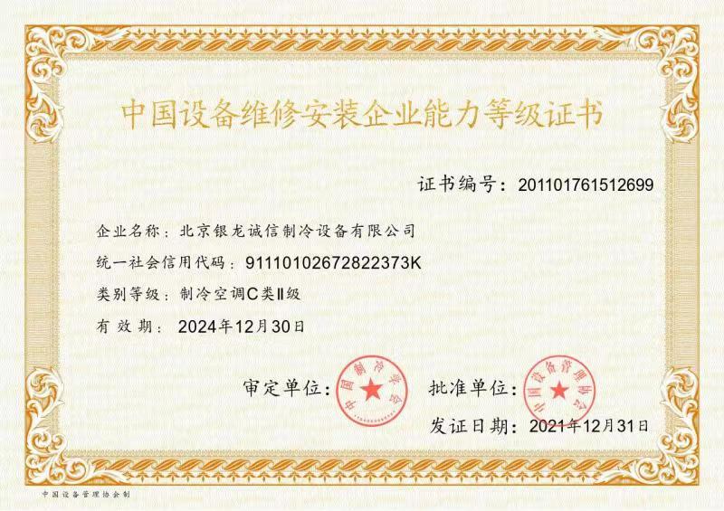 2007年:獲準成為北京市制冷行業技術學會理事單位; 2009年:獲得北京市大興區百強企業認證; 2009年:獲得國家高新技術企業認證; 2011年:獲北京市安全生產先進企業稱號,節(jié)能環(huán)保先進單位; 2012年:通過了國家高新技術企業復審; 2013年:公司董事長獲"2013北京先進企業家"榮譽稱號; 2014年:獲2014年度中國冷庫工程安裝設計造價行業十大品牌;